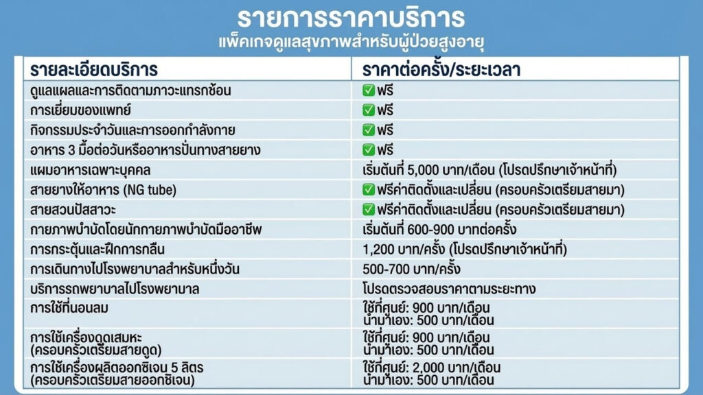 อัตราค่าบริการเสริมของเราเป็นไปตามมาตรฐานกระทรวงสาธารณสุข ครอบคลุมทุกความต้องการด้วยราคาคุ้มค่า พร้อมบริการฟรีและอุปกรณ์เสริมราคาเริ่มต้นเพียงหลักร้อย เพื่อการดูแลที่มีคุณภาพและสบายใจที่สุด